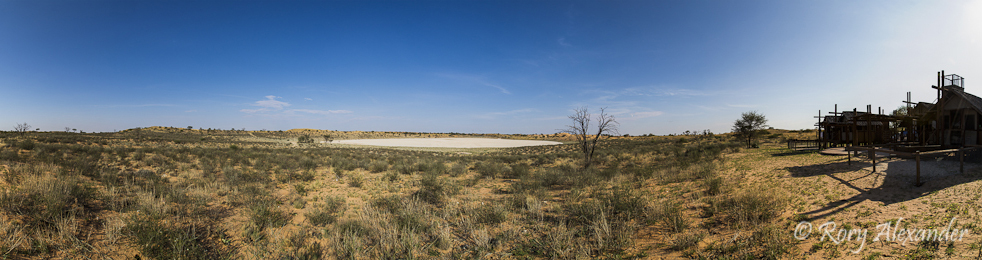 A panorama of Bitterpan Wilderness Camp, in the Kgalagadi Transfrontier Park and the salt pan it overlooks – January 2013 (click here for my timelapse video)
