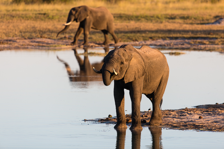 In the golden light these two elephants came to the water hole at the Nyamandhlovu Platform, one for a drink while the other went to dig for minerals